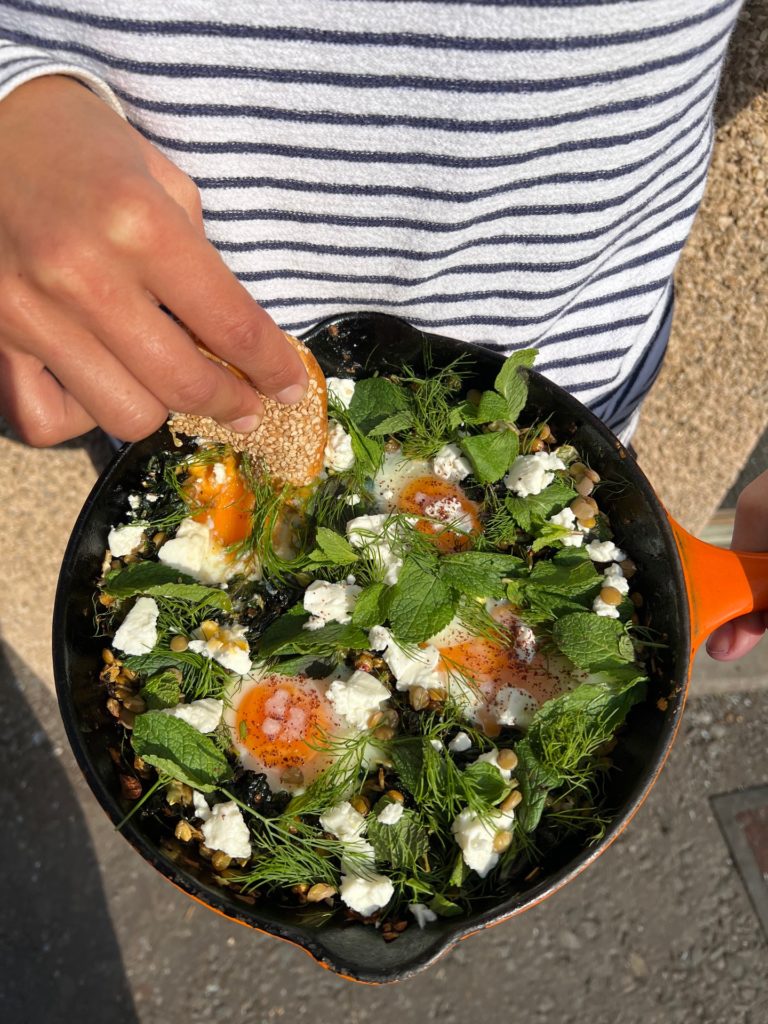 4 Top the eggs with the feta and remaining herbs and sprinkle generously with sumac. Serve with sesame Jerusalem breads or sourdough.
